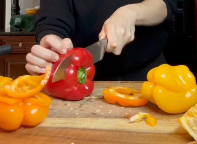 Benji swaps out the bread with bell peppers. "Pick some bell peppers. I'm going to cut them in half and seed them," he says. "Now we place our bell peppers on a baking sheet or baking dish."