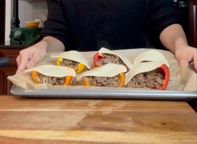 "Lastly, I'm going to top 'em with half a slice of provolone. These babies are ready, I'm going to throw 'em in the oven and bake at three 50 for 20 to 25 minutes," he says, giving the final product a "ten out of ten."