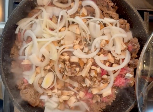 "I'm going to be using thinly sliced steak. I'm going to add in our seasonings a little bit of black pepper. Now we're going to fully cook our meat on the stovetop. We're going to add in our steak, some diced mushroom and white onion, and let that fully cook," he instructs.